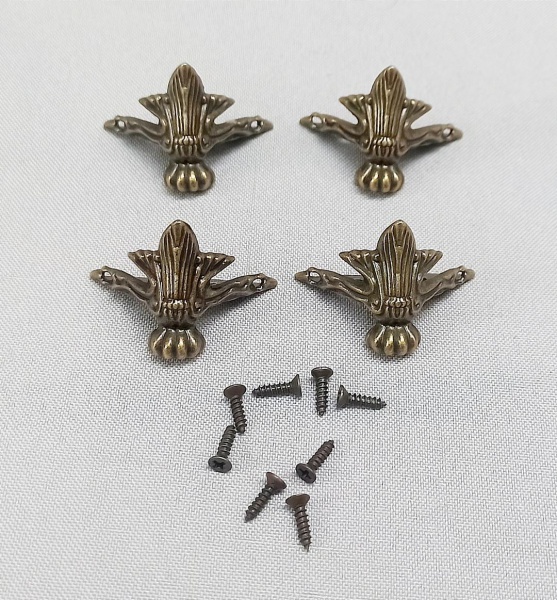 • BRONZE, conjunto de quatro (4) pés em metal no formato de garra e volutas, para ornar caixa porta joias, medindo 2,5 cm altura, novos e sem uso.
