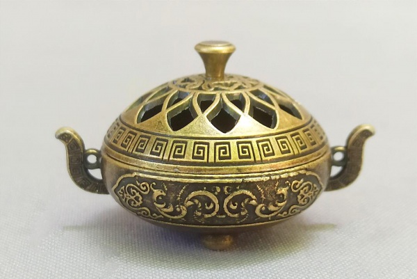 • BRONZE, um (1) incensório com ornamentação relevada em elementos vegetalistas, barrado grego em baixo relevo, tampa vazada em pétalas, pega da tampa obcônica, pés em meias esferas, medindo 3,5 cm diâmetro mais as alças, vide foto.