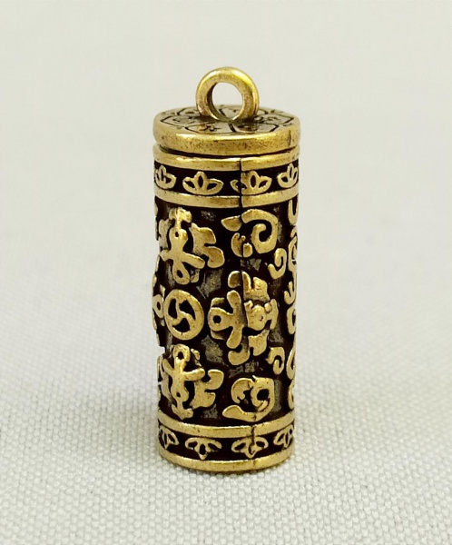 • BIJUTERIA ORIENTAL, um (1) pingente porta pílula ou veneno, cilíndrico, confeccionado em bronze, ornamentação relevada em caracteres e elementos vegetalistas, tampa rosqueável, medindo 2,5 cm mais olhal, vide foto.