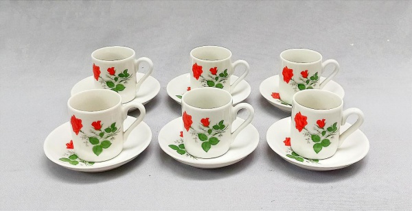 • PORCELANA, seis (6) xícaras para café, ornadas com rosas vermelhas, manufatura VERACRUZ (Pedreira, SP, 1966 a 2001, em 1966 a Cerâmica Santana adquiriu da Nadir Figueiredo as antigas instalações da Fabrica Santa Rita e fundou a Porcelana Veracruz, para produção de louças domésticas, a partir de 2001 foi incorporada pela própria Santana e passou a produzir apenas isoladores elétricos), dois pires com raspados na borda, sinais de uso, vide foto.