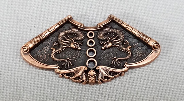 • BRONZE, um (1) incensório no formato de ventarola relevado em dragões celestiais e morcego, medindo aproximadamente 5 x 2,5 cm, vide foto.