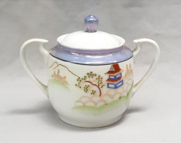 • PORCELANA JAPONESA, um (1) açucareiro com ornamentação policromada, pintada a mão, representando paisagem com montanhas e elementos vegetalistas, arremates com frisos dourados, manufatura KKR  Made in Japan, medindo 12 cm altura, sinais de uso, vide foto.