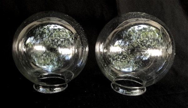 • LUMINÁRIA, par (2) globos esféricos, incolores e translúcidos, para lustre de teto, medindo aproximadamente 20 cm altura, sinais de uso e ligeiros respingos de tinta, vide foto.