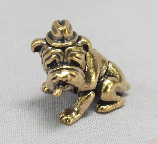 • ESCULTURA, uma (1) miniatura animalista, representando cachorro com chapéu fumando charuto, confeccionada em bronze maciço, medindo aproximadamente 2,5 x 2,5 x 2 cm, vide foto.