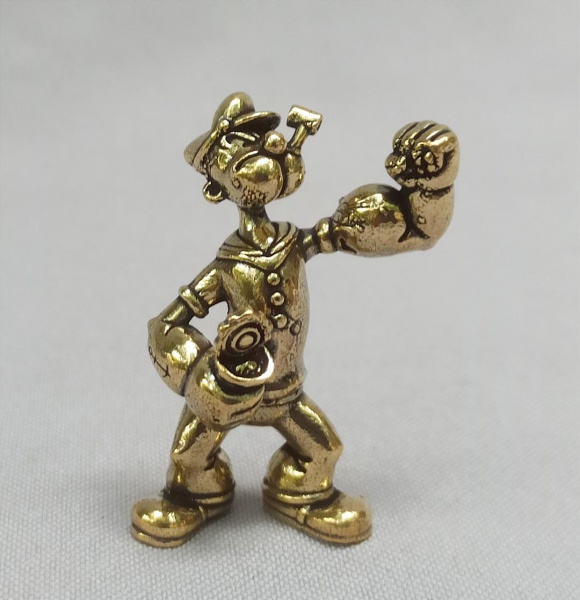 • ESCULTURA, uma (1) figurativa icônica representando Marinheiro Popeye segurando uma lata de espinafre, confeccionada em bronze maciço, medindo aproximadamente 4,5 cm altura, vide foto.