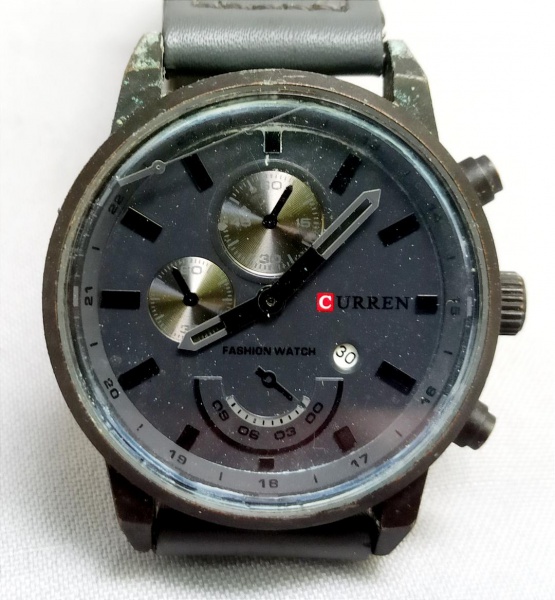 • RELÓGIO, um (1) de pulso, marca CURREN (empresa chinesa fundada em 2009, seus relógios são produzidos pela Shenzhen-Meigeer Watch Company Ltd. em Hong-Kong), quartz, multifuncional, mostrador na tonalidade chumbo, possui calendário, um ponteiro solto, caixa em metal na tonalidade preta, medindo 44 mm diâmetro, pulseira em couro, usado, não testado e sem garantia, possivelmente demanda bateria, vide foto.
