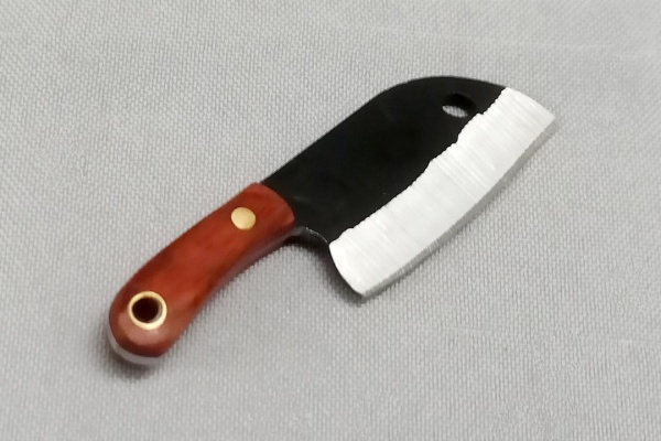 • CUTELARIA, uma (1) faca chef miniatura com lâmina em aço, afiada, empunhadura em madeira, bainha em couro ecológico na tonalidade castor, medindo aproximadamente 6 cm, nova e sem uso, vide foto.