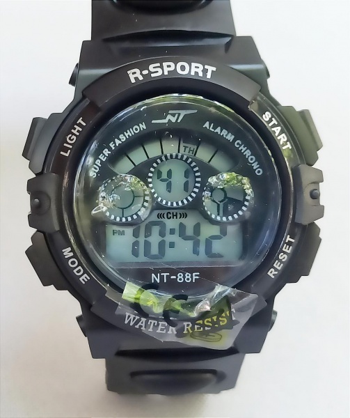 • RELÓGIO, um (1) de pulso, esportivo, digital, marca NT, modelo 88F, mostrador com 40 mm diâmetro, caixa e pulseira em polímero na tonalidade  preta, multifuncional, funcionando, novo e sem uso, vide foto.